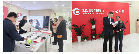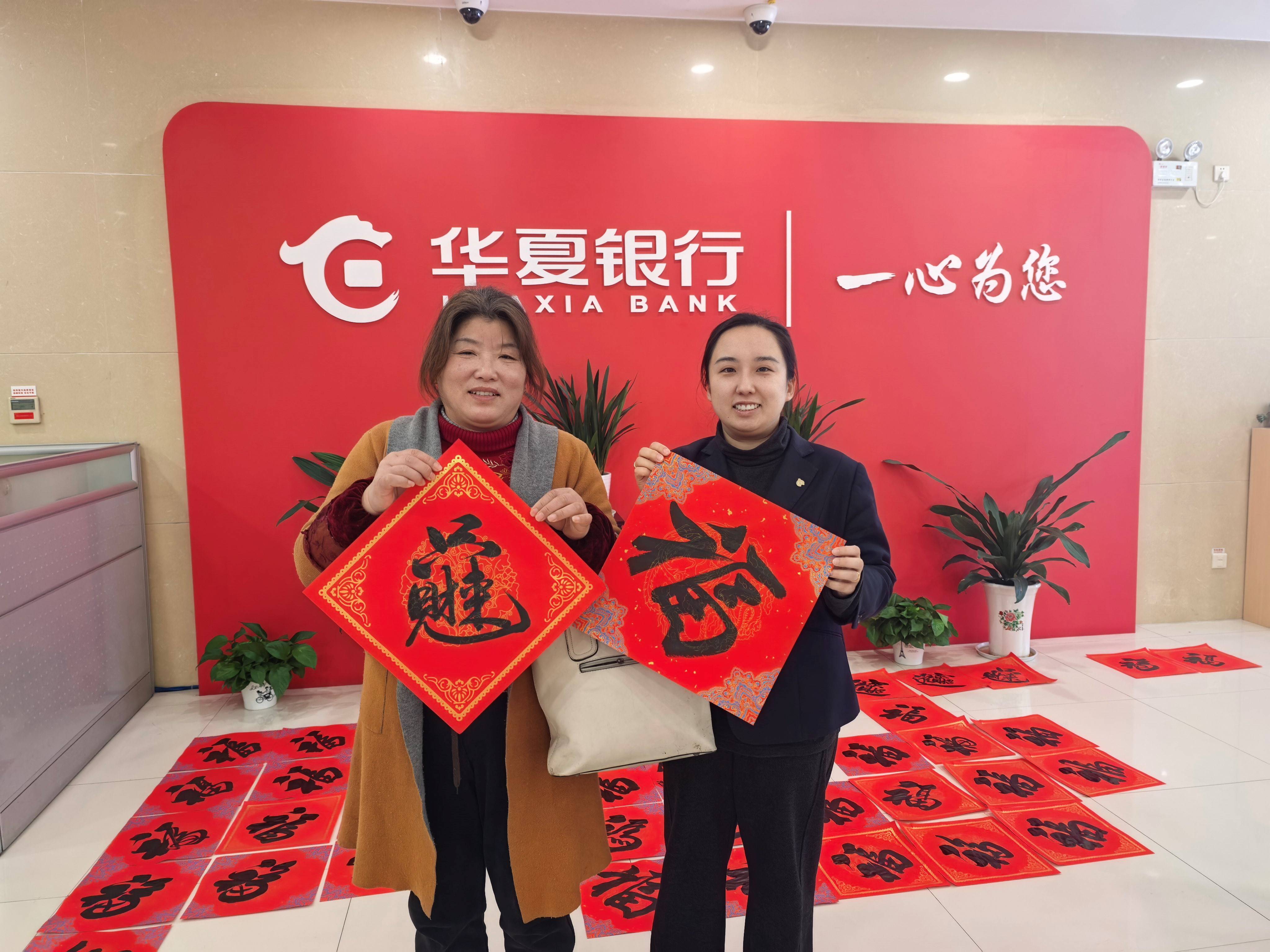 华夏银行金坛支行近日开展“幸福三公里,平安迎新年”专项活动。常州市金坛区书法家协会名誉主席杨亚明、金坛区艺海风艺术培训中心校长倪冠华等三位书法家受邀前来,开展“写对联送祝福”主题活动。